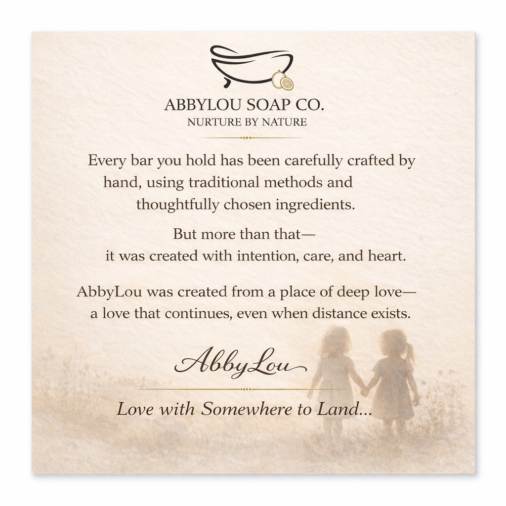 At AbbyLou Soap Co., everything begins with purpose, integrity, and transparency. Each product is crafted with great intention and a deep love for detail — from the natural oils and rich butters we select to the earth-derived clays and thoughtfully blended scents that make every bar special.